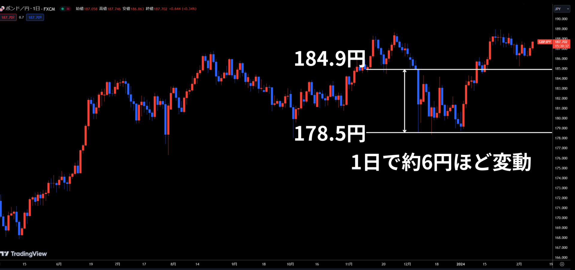 下図のポンド/円の日足チャートが大きく動いた日の値動きを見ると、184.9円から178.5円と1ポンドあたり6円以上価格が動いています。