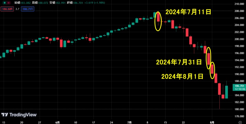 2024年頭から上昇トレンドが続いていたポンド/円は、2024年7月11日に下降トレンドに転じました。