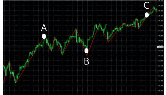 ZigZag(ジグザグ)とは、アーサー・A・メリル氏が著書の「Filtered Waves」の中で提唱したテクニカル指標で、トレンドの判断に活用できます。