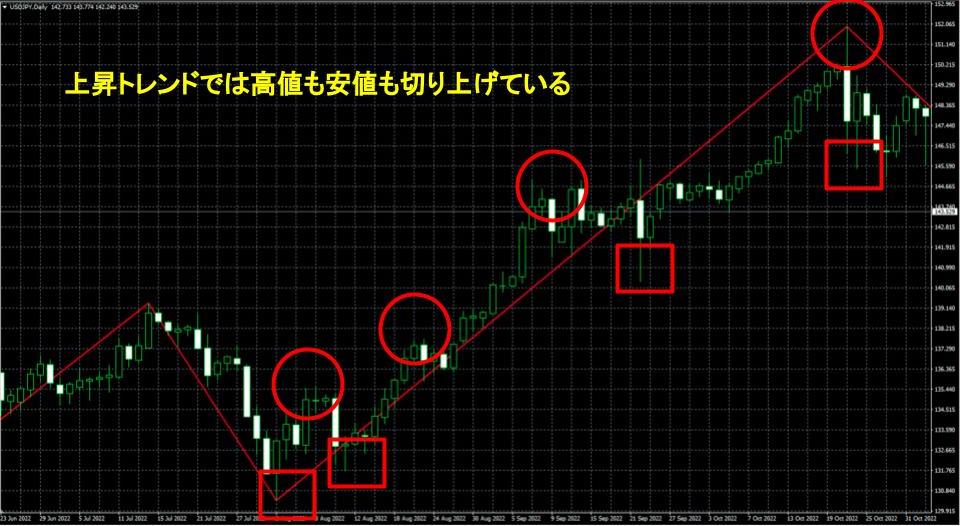 上昇トレンドの場合、高値と安値が更新し続けている上昇トレンドの場合、高値と安値が更新し続けていることがわかります。