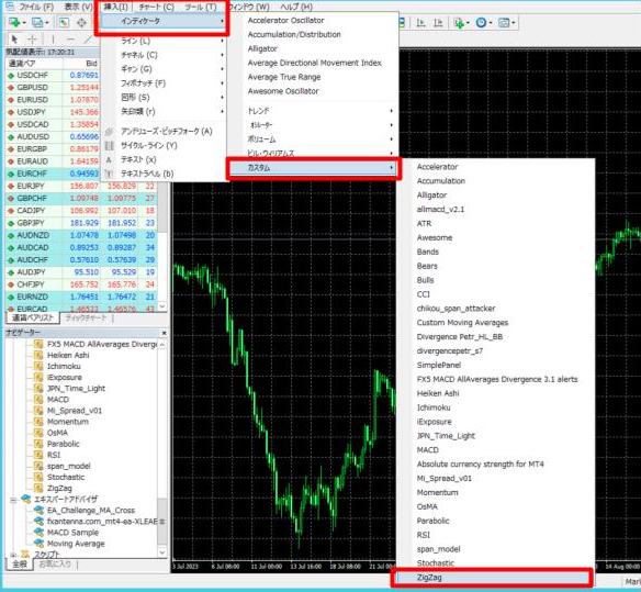 MT5を起動してZigZagを選択する続いて「インジケーター」「カスタム」「ZigZag」の順で押していきましょう。