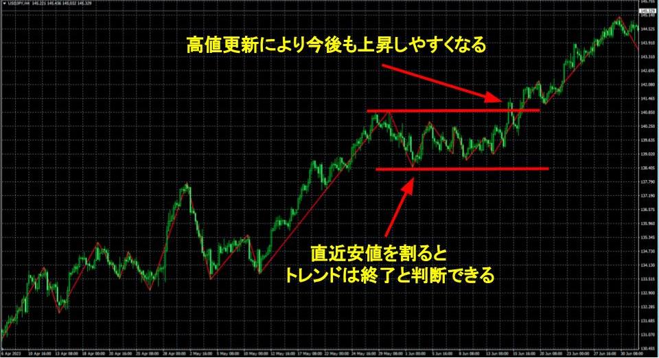 そして、上昇トレンドの場合価格が高値を超えていけばトレンドが継続すると判断し、直近の安値を下回った場合はトレンドが終了したと考えることができます。