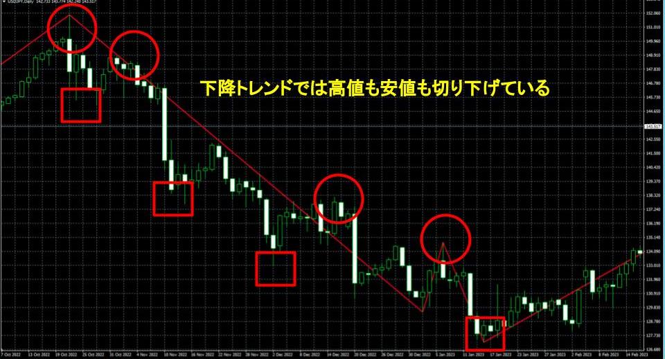 トレンドの判断下降トレンドにおいては、高値も安値も切り下げています。