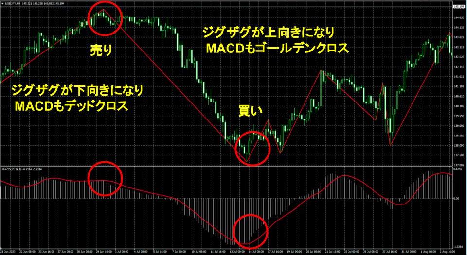 下図のチャートの左側では、ZigZagが下向きになったタイミングに、MACDにデッドクロスが出現しています。