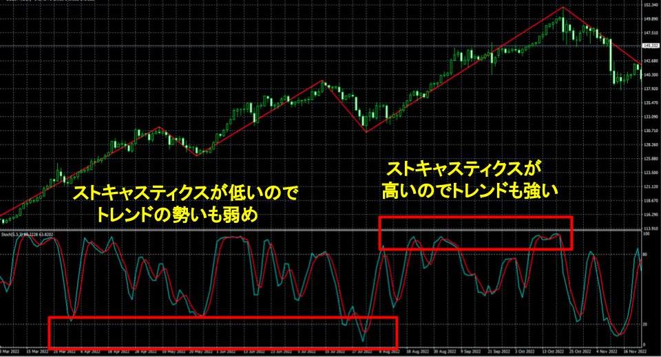 ストキャスティクスでトレンドの強さを確認する一方、ZigZagで上昇トレンドかつストキャスティクスも上昇していれば、トレンドが強いと判断できます。