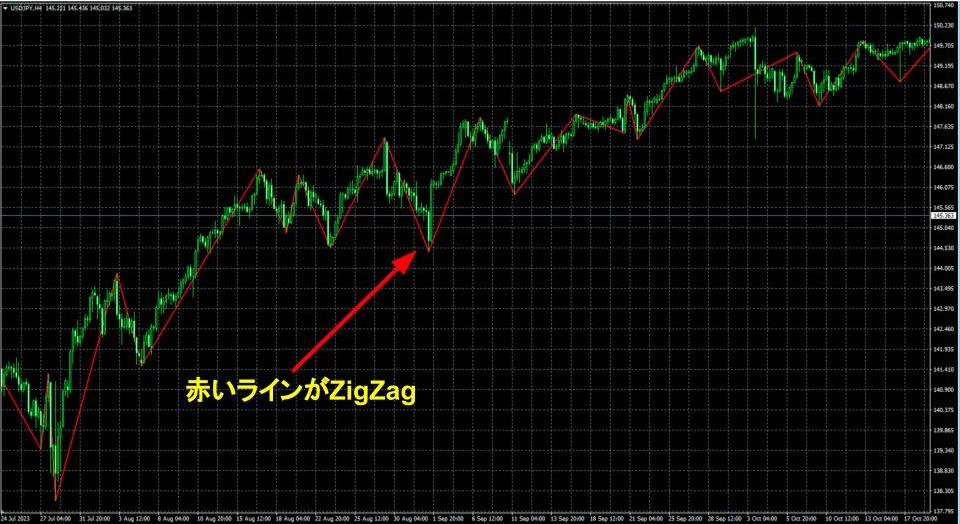 下図のようにZigZagがチャート上に表示されれば、設定完了です。