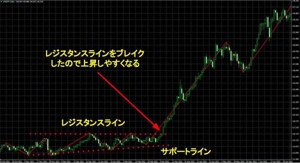 サポートラインやレジスタンスラインを引く上図では、レジスタンスラインをブレイクしているので、買いエントリーすることでトレンドの初動に乗れる可能性があります。