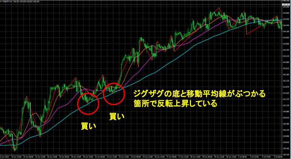 下図のチャートでは、移動平均線とZigZagの底がぶつかる箇所で反転し、上昇しています。