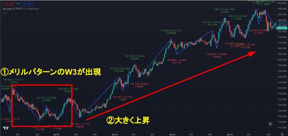 メリルパターンのW3が出現後に大きく上昇このようにメリルパターンが出現したときは、相場が大きく動く可能性があるので、ZigZagでパターンを確認しながらエントリーしてみましょう。