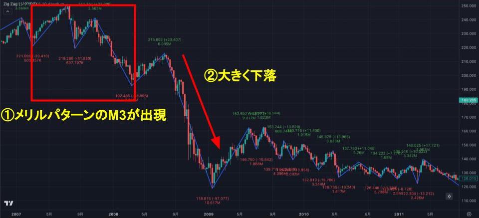 下図のチャートの左端では、メリルパターンM3が出現後に相場が大きく下落しています。