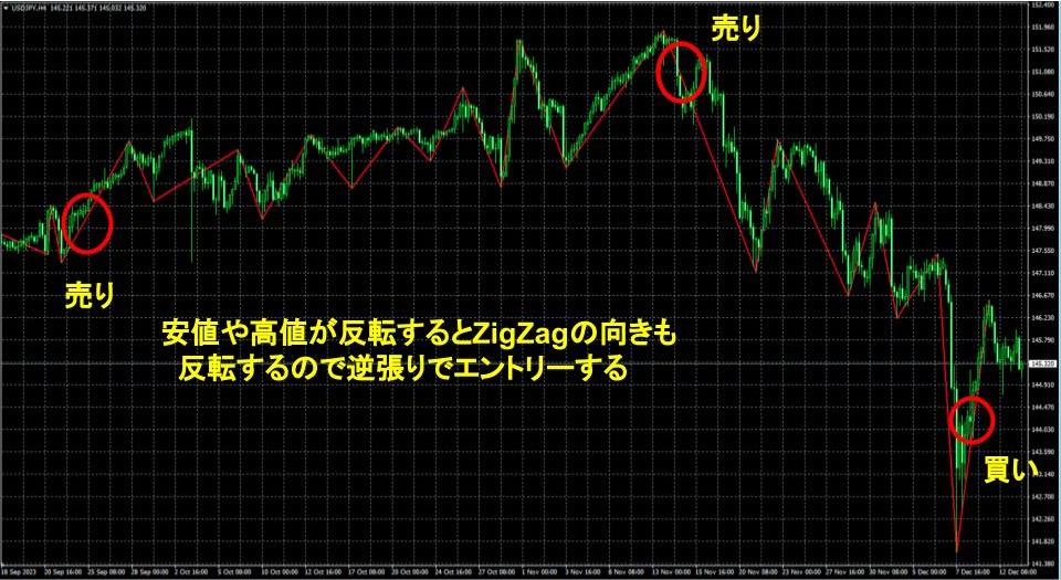 ZigZagを使った基本的なトレード方法は、転換ポイントでの逆張りです。
