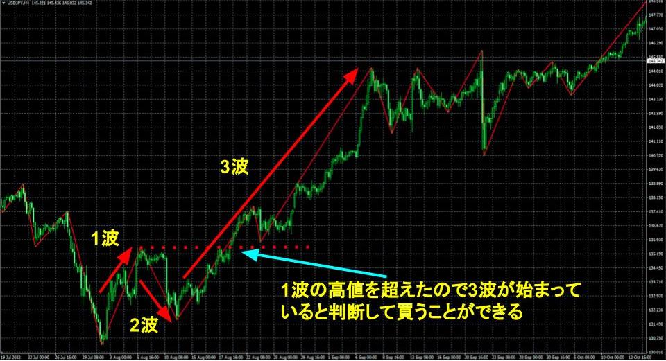エリオット波動では、価格が1波の高値を超えると本格的に上昇しやすくなるため、3波が始まっていると判断し、買いエントリーをすれば利益を狙うことができます。