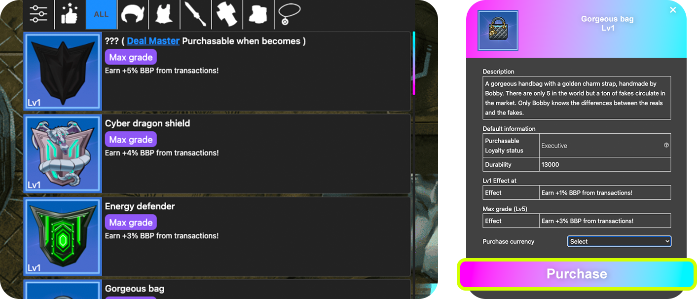 | Gorgeous Bag | Shield | BBP acquisition rate will be increased by up to 3% |