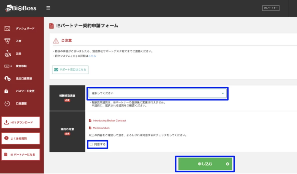 マイページにログイン後、左側のメニュー下部にある「IBパートナーになる」をクリックして、「IBパートナー契約申請フォーム」を開きます。