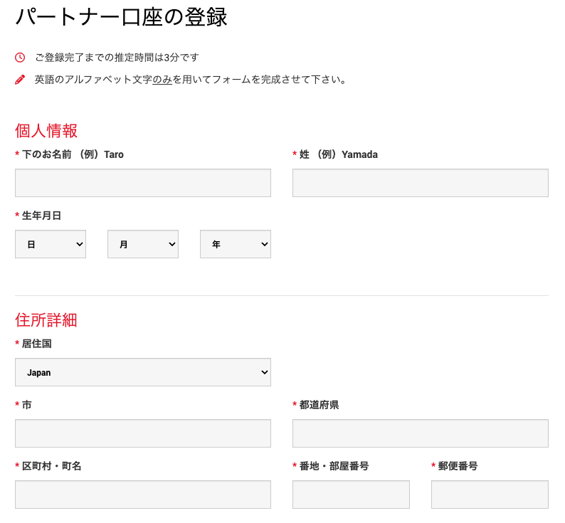 口座開設のURLをクリックしたら、必要事項を入力する画面が表示されます。