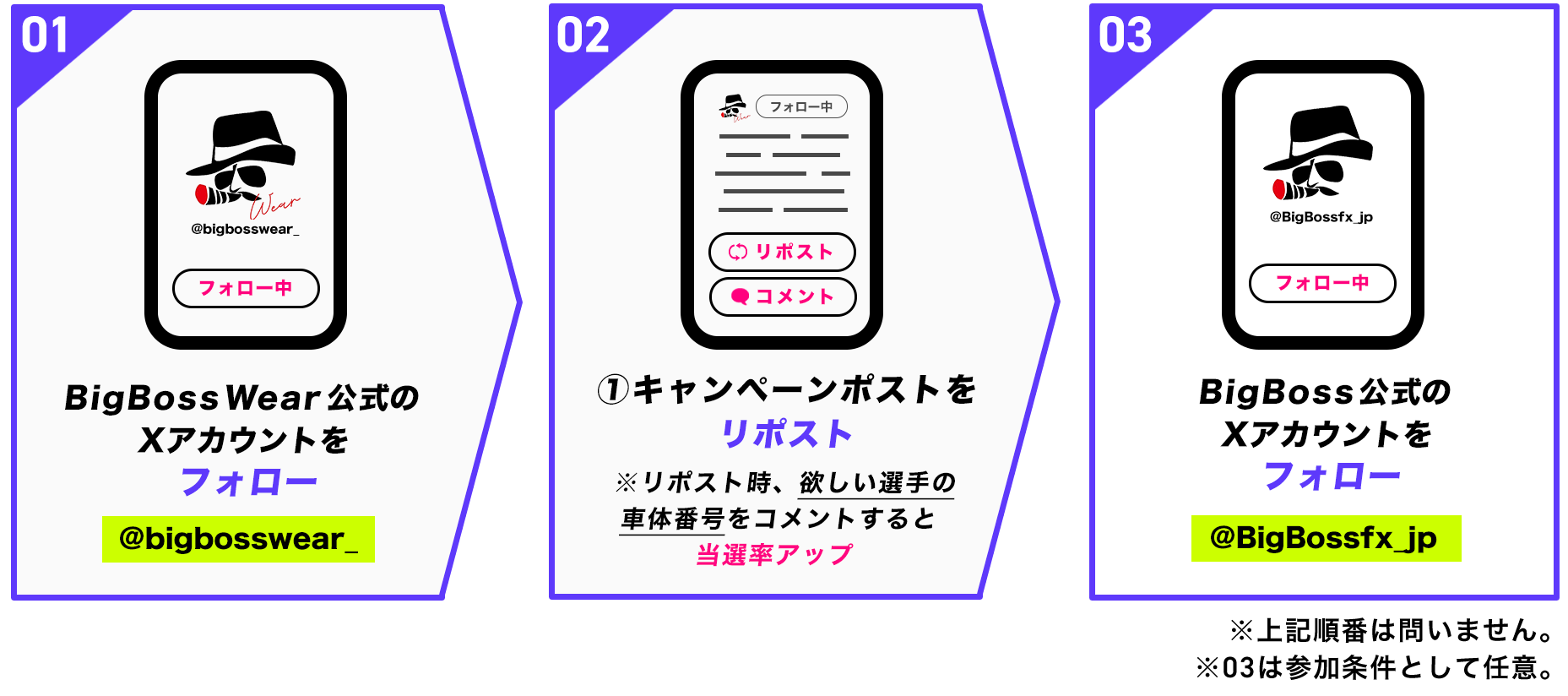 | 対象者 | ・BigBoss Wear公式Xアカウントをフォローされている方 Follow @bigbosswear_ ・対象のポストをリポスト(RP)した方 ※上記順番は問いません。 |