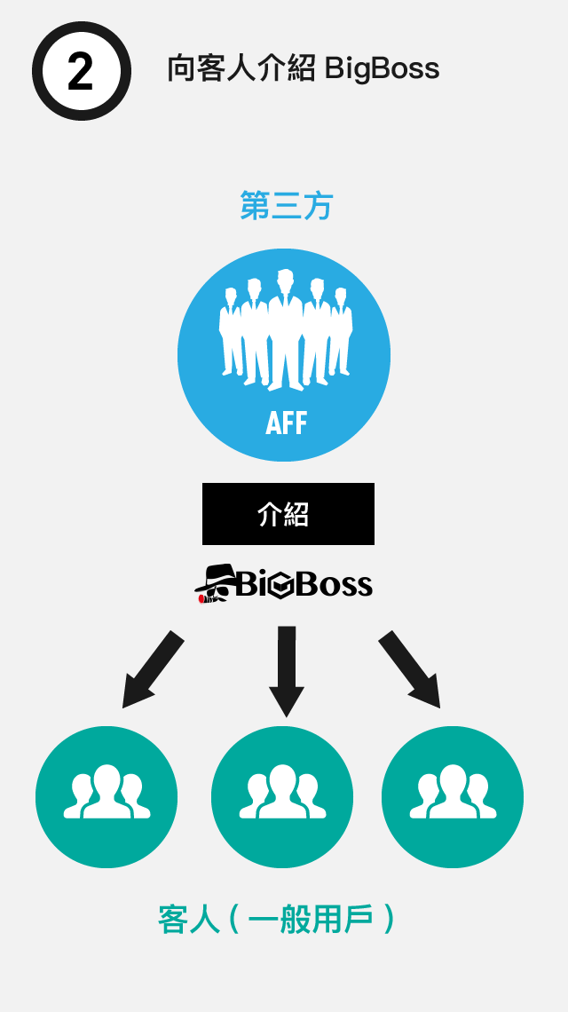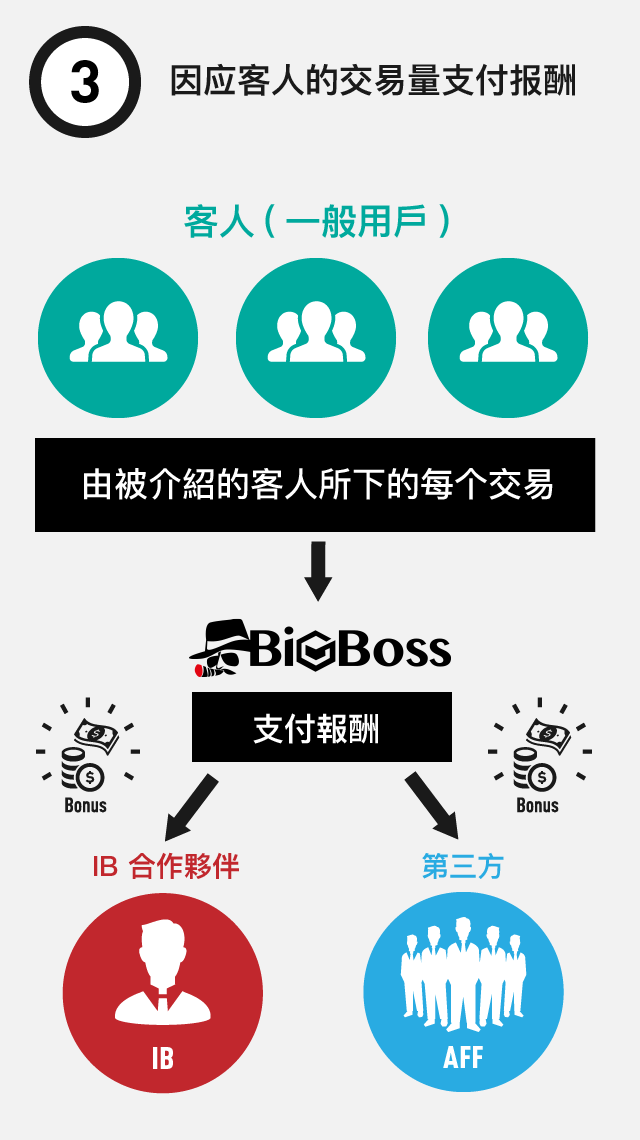 透过你介绍的客户不断地在BigBoss平台上交易, 你可以持续获取佣金收入。