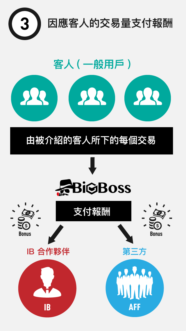 IB可以讓旗下第三方合作夥伴介紹客戶,並透過客戶交易量獲取佣金收入。