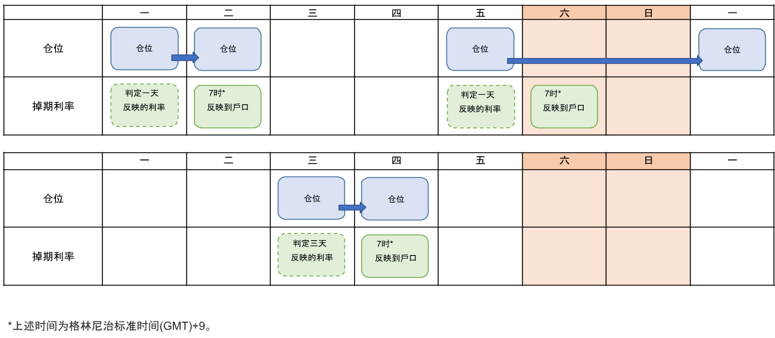 ・星期一持有的仓位的掉期点(掉期率),将在交易日结束时(星期一,格林威治标准时间21时或22时)反映。